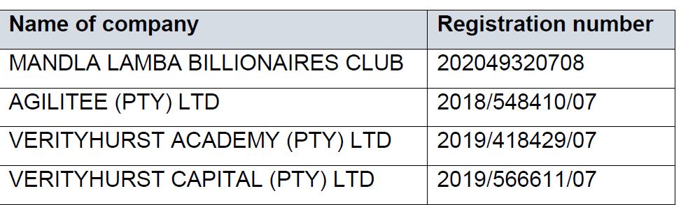 Mandla Lamba is linked to amongst others, the following companies and it should be noted that the below companies are also not authorised in terms of the of the FAIS Act: