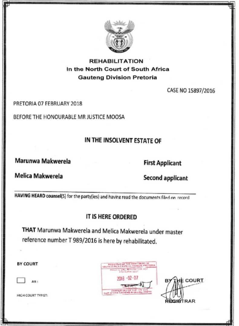 In his defence, Makwarela told the media that he was still awaiting his “rehabilitated insolvent” certificate.