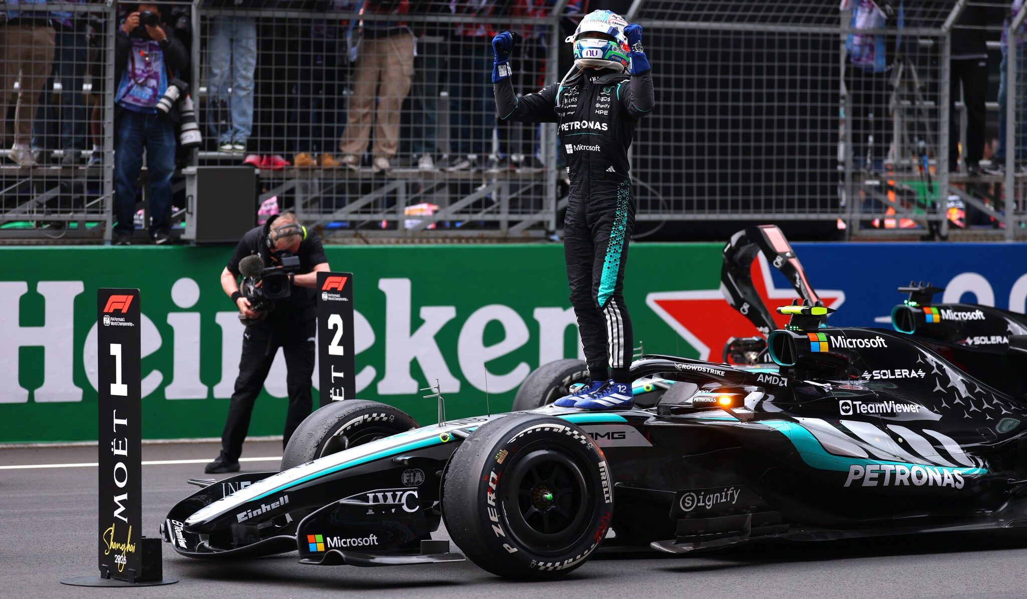 Starting from pole position in Shanghai, Antonelli briefly lost the lead at the start when Ferrari’s Lewis Hamilton surged ahead after the Mercedes driver covered the inside line against teammate George Russell.