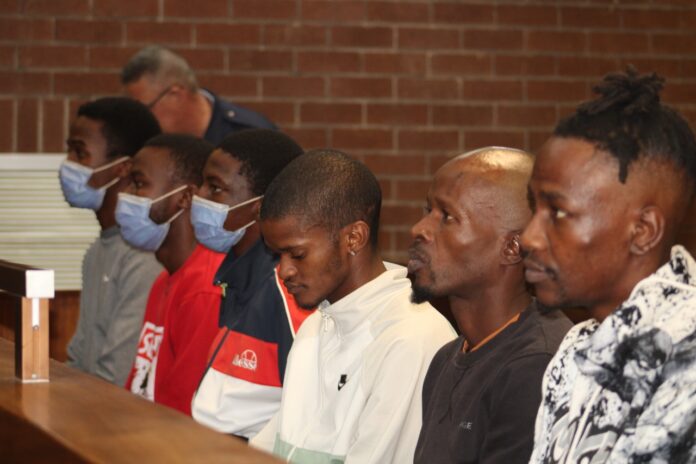 Ndumiso Ndura Moswane, 26, Fernando Nando Sive, 25, Nhlakanipho Dlamini, 21, Xaba, 25, Maredi Mphahlele, 36, and Thembinkosi Hlomikhawu, 31, made their sixth appearance at the Roodepoort magistrate’s court on Tuesday.