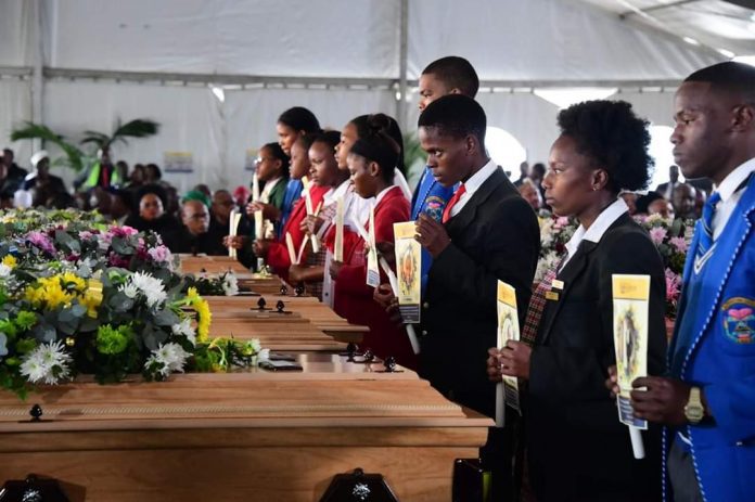 At the funeral service venue on Wednesday, the mood was sombre and family members and learners could be heard weeping and groaning from the moment the 19 coffins were brought inside the giant marquee.
