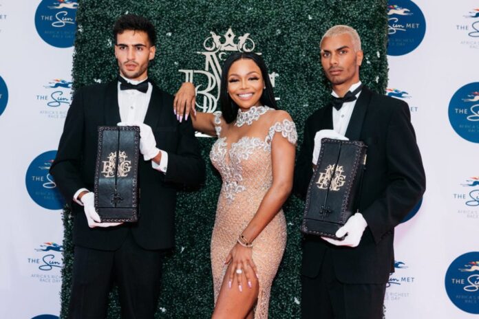 Matheba arrived at the Sun Met, Kenilworth Racecourse in flamboyant style, flanked by two uniformed butlers carrying her Prestige Reserve , creating an event in itself.