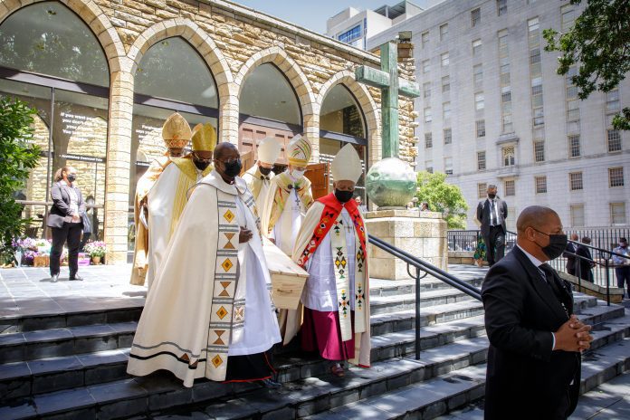 CAPE TOWN, SOUTH AFRICA – JANUARY 01: The coffin of Archbishop Desmond Tutu leaving GeorgeÂ’s Cathedral Church on January 01, 2022 in Cape Town, South Africa. Archbishop Desmond Tutu was a South African Anglican bishop and theologian, known for his work as a human rights and anti-apartheid activist. He died on 26 December 2021. Archbishop Desmond Tutu was awarded a special category one state funeral. (Photo by Gallo Images/ER Lombard)