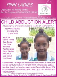 Alexia was found dead in sugarcane fields outside Glendale, KwaZulu-Natal, yesterday, after she was reported missing on Sunday.