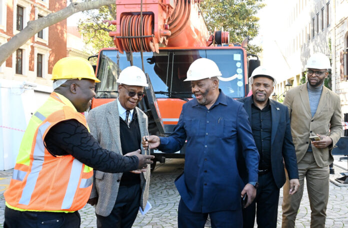 During a media briefing on Thursday, parliament officials, including Acting Speaker Lechesa Tsenoli, NCOP chairperson Amos Masondo, and secretary to parliament Xolile George, handed over the keys to constructor Lucky Qotoyi from Maziya General Services to commence the reconstruction process.