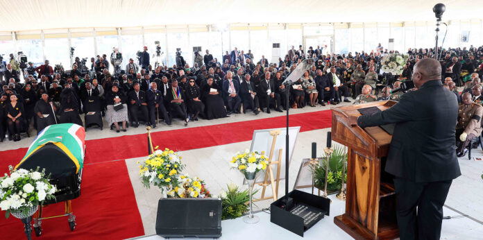 Standing before a sea of mourners gathered in three tents and grandstands at Hoërskool Bergvlam in Mbombela, Ramaphosa described Mabuza as “a servant of the people” whose political legacy will be “forever remembered”.
