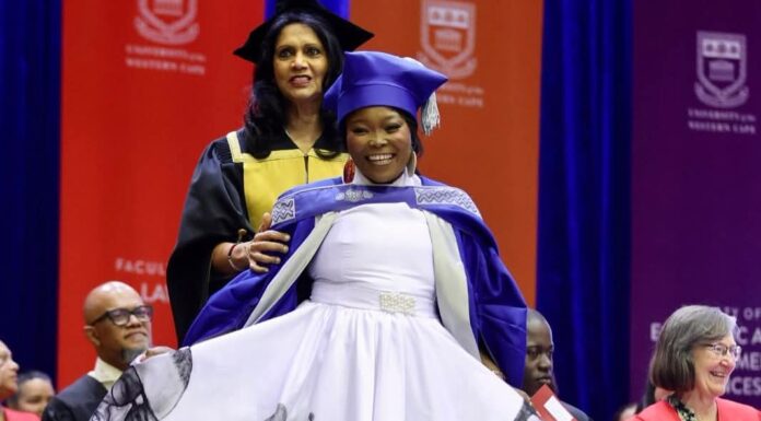 In a video seen posted on Facebook in December 2025, recorded during her PhD graduation at the University of the Western Cape, Motseki appears draped in both triumph and tragedy.