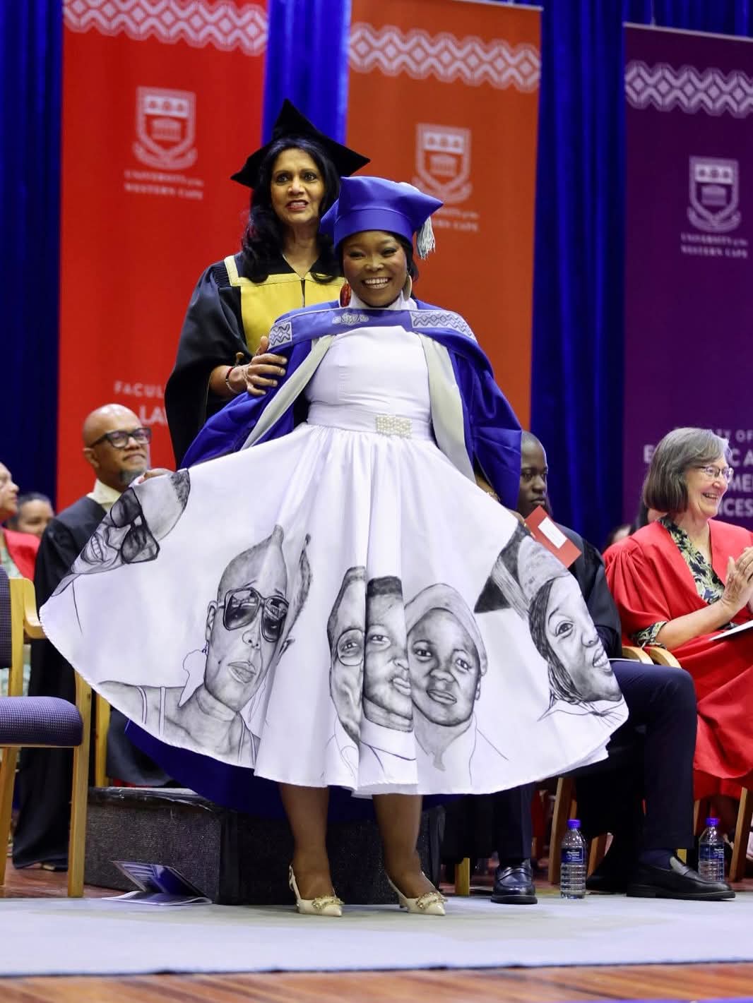 Wearing a custom-made dress printed with the faces of her deceased relatives, she spoke softly about the losses she endured during her academic journey.