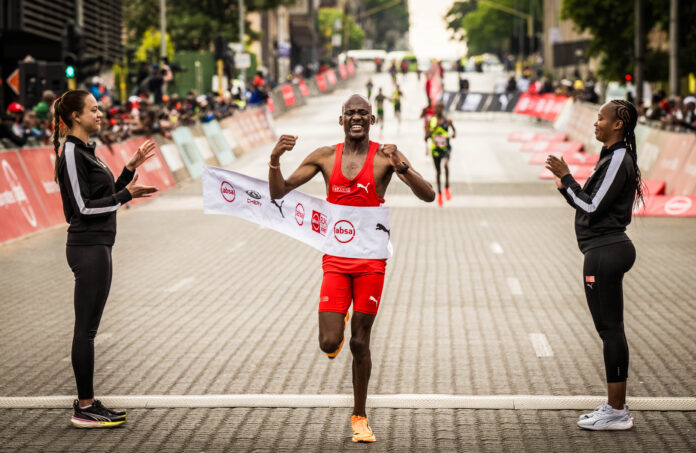 He then stormed into the home straight on Rahima Moosa Street untroubled, crossing the line at Mary Fitzgerald Square in Newtown in a new course record 28:39, with four fingers raised in triumph.